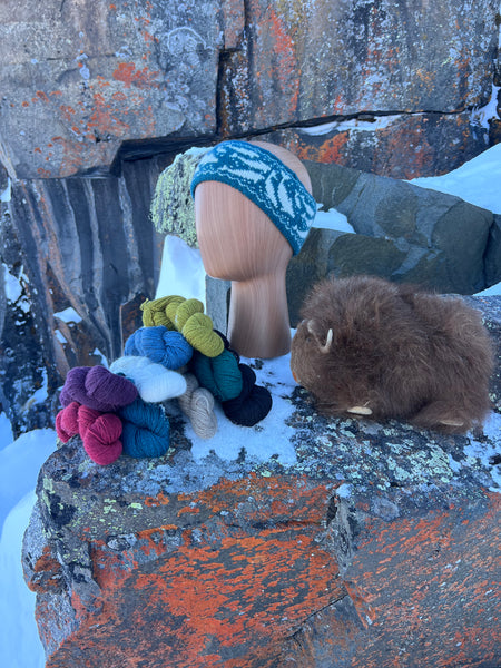 These headbands are available in 8 colours and 3 designs or motifs from the same Nunavut Qiviut yarn and motifs as our toques. They base colour is made from 50/40/10 qiviut/superfine merino/silk yarn in natural and 7 organically dyed colours. The Qilalugaq (beluga whale) and Nanuq (polar bear) motifs are made with 30/60/10 Arctic Fox/superfine merino/silk yarn. For the Umingmak (muskox) motif, we use midnight 50/40/10 qiviut/superfine merino/silk yarn, so we do not sell Umingmak headbands in the midnight base colour. The band of the headband has two layers to provide extra warmth and comfort.